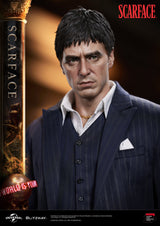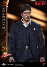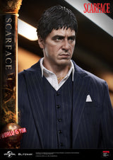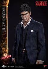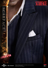 This figure encapsulates Tony Montana’s journey of moral decay amidst his escalating pursuit of success, accentuated by opulent suits and a diorama base representing a pivotal scene from the film.