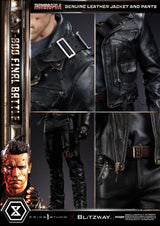 This time, we are taking you back to the climax of the movie, the final battle between T-800 and T-1000 at the steel mill, bringing you a hyper-realistic screen-accurate depiction of a battle-damaged T-800. As usual, Blitzway masterfully sculpted this 29-inch-tall work of art. The fierce battle against the new and improved T-1000 has caused substantial damage to the protagonist. Once again, breath-taking craftsmanship to recreate T-800 in all his menacing splendor from the final act: ripped flesh, revealing the endoskeleton underneath as well as the built-in LED illuminated right eye. Every aspect and detail of the outfit has been meticulously and masterfully replicated. Genuine black leather has been used to recreate the Terminator’s outfit with masterful attention to detail. We are talking bullet holes, zippers, pockets, and buckles on the stunning biker jacket, accessorized with a textile cartridge belt. Torn pant-leg showing a glimpse of the exposed endo-leg underneath. Two right-arm parts allow you to display either the grenade launcher or the rod used to sever his left arm that got trapped in a set of heavy gears during the intense struggle with Skynet’s assassin. T-800 Final Battle stands atop a steel-factory-themed base that is also LED-illuminated. At his feet is a chain hoist hook as well as up to six scattered grenade launcher bullets.
